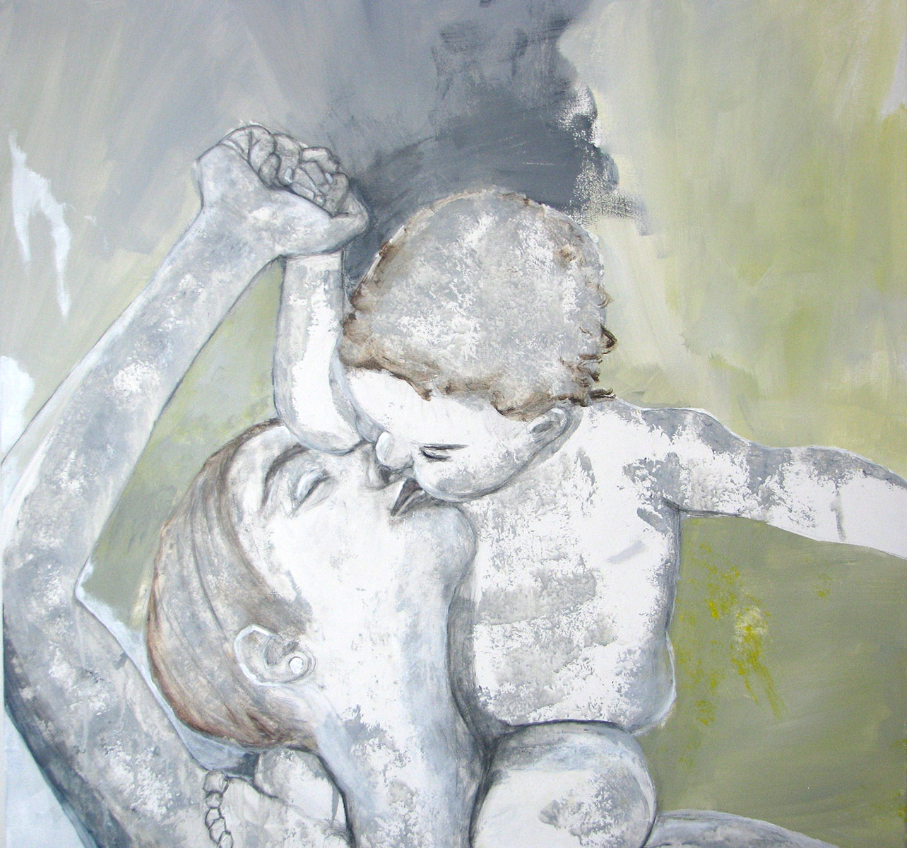 Série de portraits inspirés de la famille et proches. L’utilisation de jaune, rose, vert s’ajoute aux gris et bruns caractéristiques des réalisations de l’artiste. Le geste demeure large, imprécis parfois, ce qui démarque Marie-Andrée du courant actuel qui se veut souvent un calque de la réalité. Le résultat est une oeuvre chargée d’émotion qui par son originalité confirme l’unicité du travail de l’artiste.